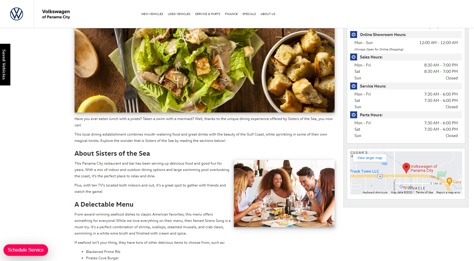My client, VW of Panama City, wanted to showcase a local dining establishment on their website. I was tasked with creating a short blog-style post highlighting Sisters of the Sea’s standout qualities.